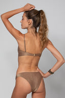 Réalisée dans un tissu LUREX lumineux, la culotte Helena capte la lumière et fait ressortir un subtil effet scintillant, soulignant la silhouette avec finesse et élégance. Sa matière douce et extensible assure un porté agréable et un confort optimal, idéale pour la baignade comme pour les moments de détente au bord de l'eau.